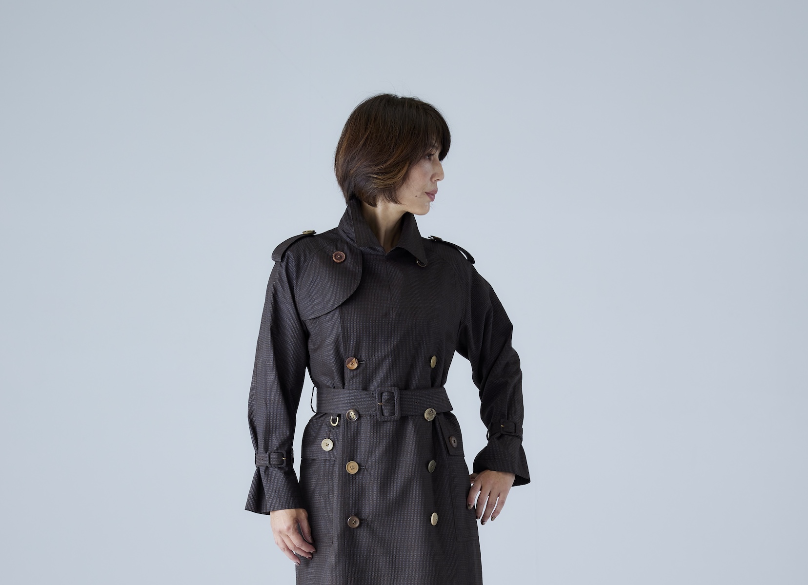 AITTA’ s trench coats elegantly merge the classic design of the trench coat with contemporary fashion sensibilities—a hybrid of tradition and modernity. This approach reflects our profound appreciation for both heritage and innovation. Given the trench coat’ s length and its myriad components, such as flaps and belts, a single kimono is insufficient for its construction. To address this, we employ the “crazy pattern” tailoring technique, utilizing multiple Oshima tsumugi kimonos. Our commitment to sustainability is evident as surplus fabric from one garment is ingeniously repurposed in subsequent pieces. This methodology embodies our modern production philosophy, which cherishes both the spirit of “mottainai” (the Japanese principle of minimizing waste) and an inventive creativity.